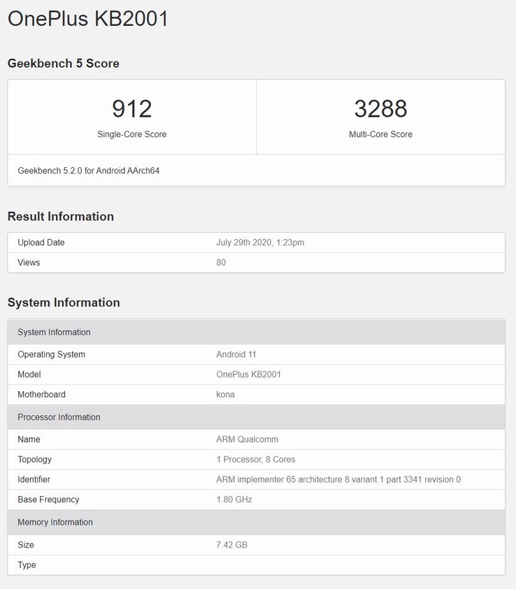 KB2001 nennt sich das brandneue OnePlus-Modell, das sich in der Benchmark 5-Datenbank mit ersten Scores bemerkbar machte. Die erzielten Werte sind zwar noch verbesserungswürdig, dennoch dürfte hier schon der auf maximal 3,1 GHz übertaktete Snapdragon 865+ mit neuen Features wie Bluetooth 5.2-Support drin stecken, auch wenn sich der in Geekbench genutzte Codename "kona" nicht von dem des regulären Snapdragon 865 unterscheidet.