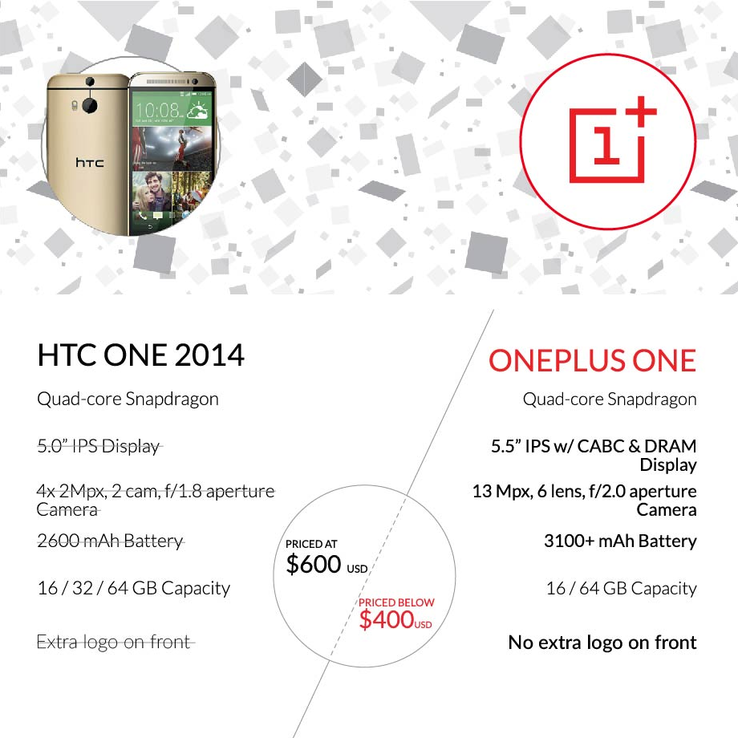 „StyleSwap“ nennt OnePlus die Möglichkeit, das Gehäuse an der Rückseite auszutauschen. Ferner ist offiziell bekannt, dass das OnePlus One wahlweise mit 16 GB oder 64 GB internem Speicher verfügbar sein wird. Die Displayränder sollen so dünn ausfallen, dass man das Smartphone unter dem Xperia Z1 mit fünf Zoll großem Display verbergen kann. OnePlus legt sich in seiner Werbung vor allem mit dem HTC One M8 an, wie der Name bereits vermuten lässt. Einige der Features sind auf dem Papier dem One M8 überlegen – aber das mag in der Praxis nicht viel bedeuten. Am 23. April wird OnePlus das hauseigene One offiziell ankündigen. Der Preis von unter 350 Euro ist schon einmal eine deutliche Kampfansage. Das HTC One M8 kostet 680 Euro.