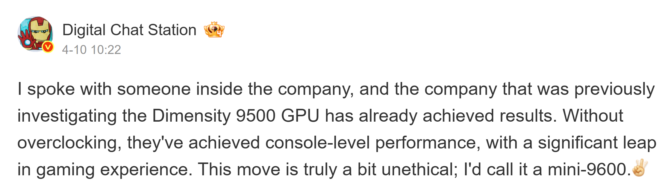 Der bekannte Leaker berichtet, dass das Unternehmen die GPU des Dimensity 9500 genau unter die Lupe genommen und damit bereits beachtliche Ergebnisse erzielt hat. Diese modifizierte GPU – die ARM Mali G1-Ultra MC12 – soll offenbar „Performance auf Konsolenniveau“ liefern, und zwar ganz ohne Übertaktung.