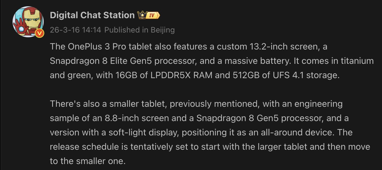 Nun deutet ein neuer Leak des bekannten Insiders Digital Chat Station darauf hin, dass OnePlus am Pad 3 Pro arbeitet. Die Displaygröße soll weiterhin bei 13,2 Zoll liegen und damit dem Panel des Pad 3 entsprechen. Die wichtigste Neuerung dürfte jedoch bei der Leistung liegen. Dem Leak zufolge soll das Tablet mit dem Snapdragon 8 Elite Gen 5 ausgestattet sein – also mit demselben Chip, der auch im Flaggschiff-Smartphone OnePlus 15 (derzeit für 899 Euro bei Amazon erhältlich) zum Einsatz kommt.