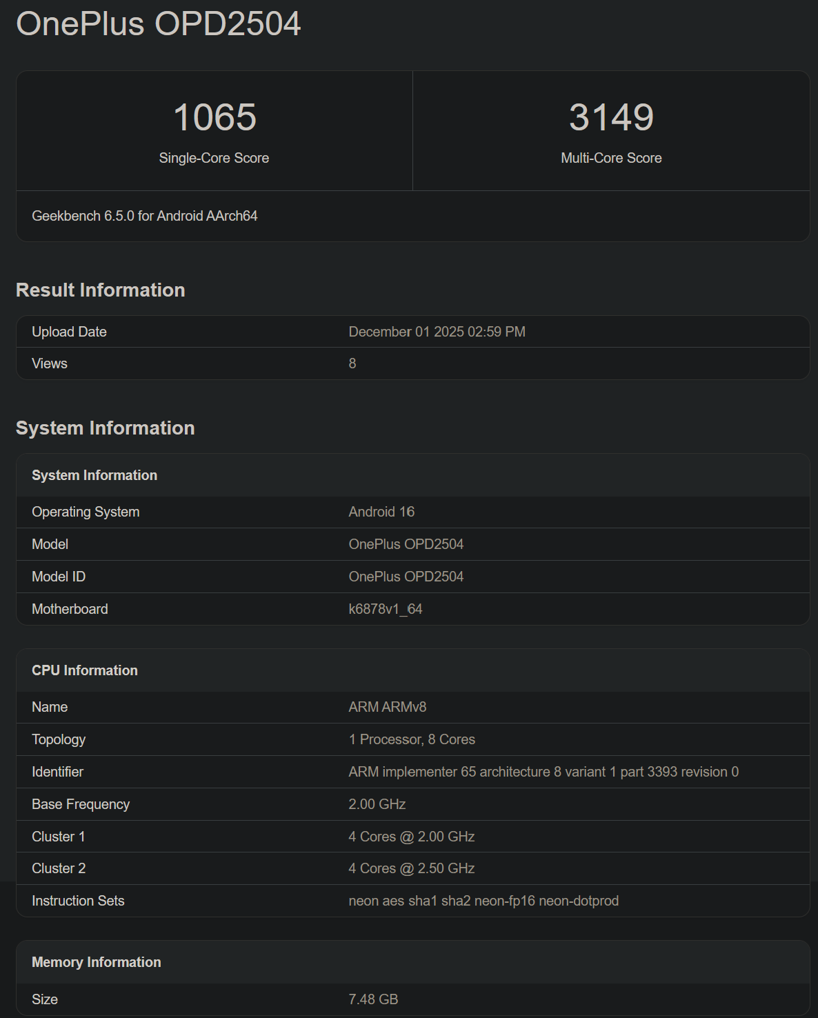Genauer gesagt wird das OnePlus Pad Go 2 als OnePlus OPD2504 gelistet und scheint mit einem MediaTek Dimensity 7300 Prozessor bestückt zu sein. Dieser bietet vier Performance-Kerne mit einer Taktrate von 2,5 GHz, während die vier Effizienz-Kernen mit 2,0 GHz laufen. Dazu gesellen sich eine ARM Mali-G615 MC2 Grafikeinheit und 8GB Arbeitsspeicher. In den Single- und Multi-Core-Benchmarks von Geekbench erreicht der Chipsatz 1065 beziehungsweise 3149 Punkte, was insgesamt den üblichen Leistungswerten des Dimensity 7300 entspricht.