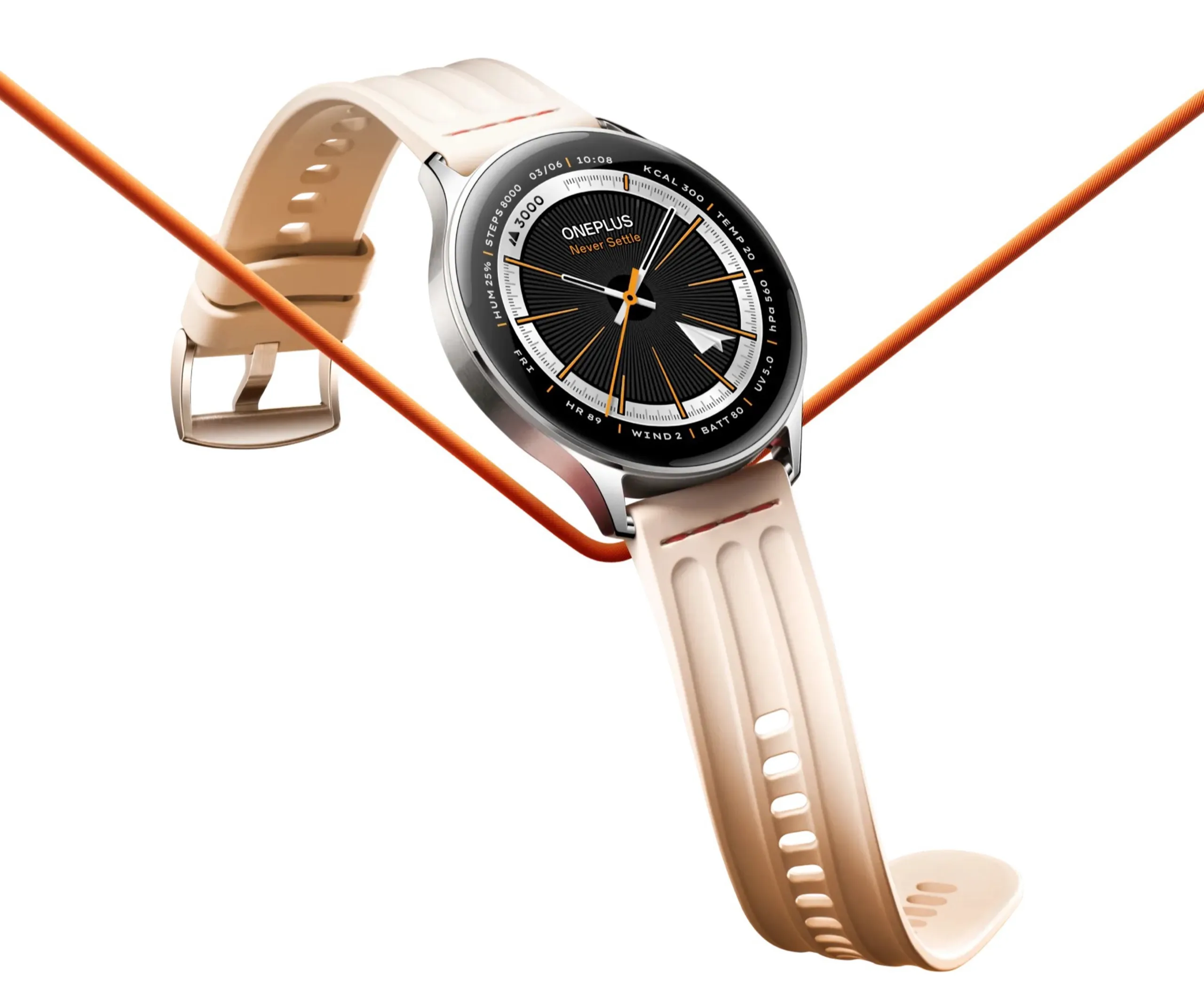 OnePlus verbaut ein rundes AMOLED-Display mit einer Bildschirmdiagonale von 1,46 Zoll und einer beachtlichen Helligkeit von 3.000 Nits, die allerdings nur bei Outdoor-Workouts zur Verfügung steht. Das Display unterstützt ein Always-on-Display, durch das die Akkulaufzeit allerdings von sieben bis zehn auf vier Tage reduziert wird. Die Uhr besitzt einen Herzfrequenz- und einen SpO2-Sensor, einen Hauttemperatur-Sensor, einen Beschleunigungsmesser und einen Umgebungslichtsensor, um die Helligkeit des Displays automatisch anzupassen.