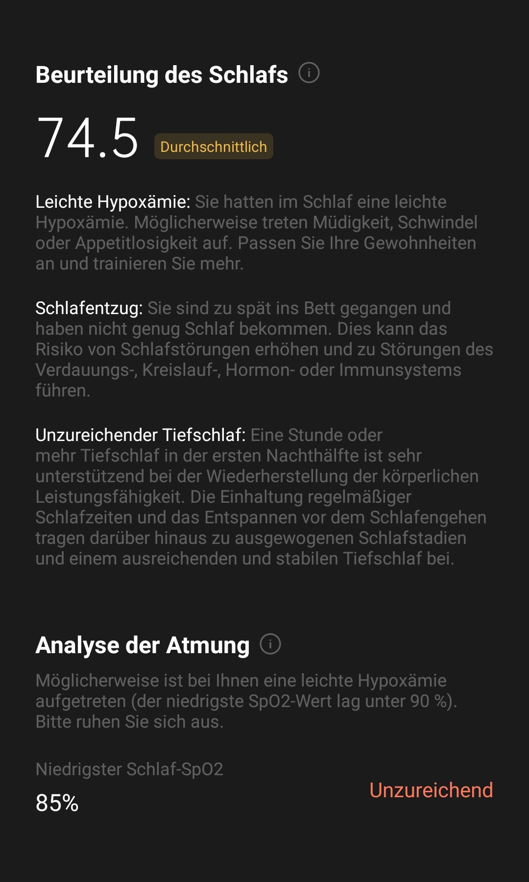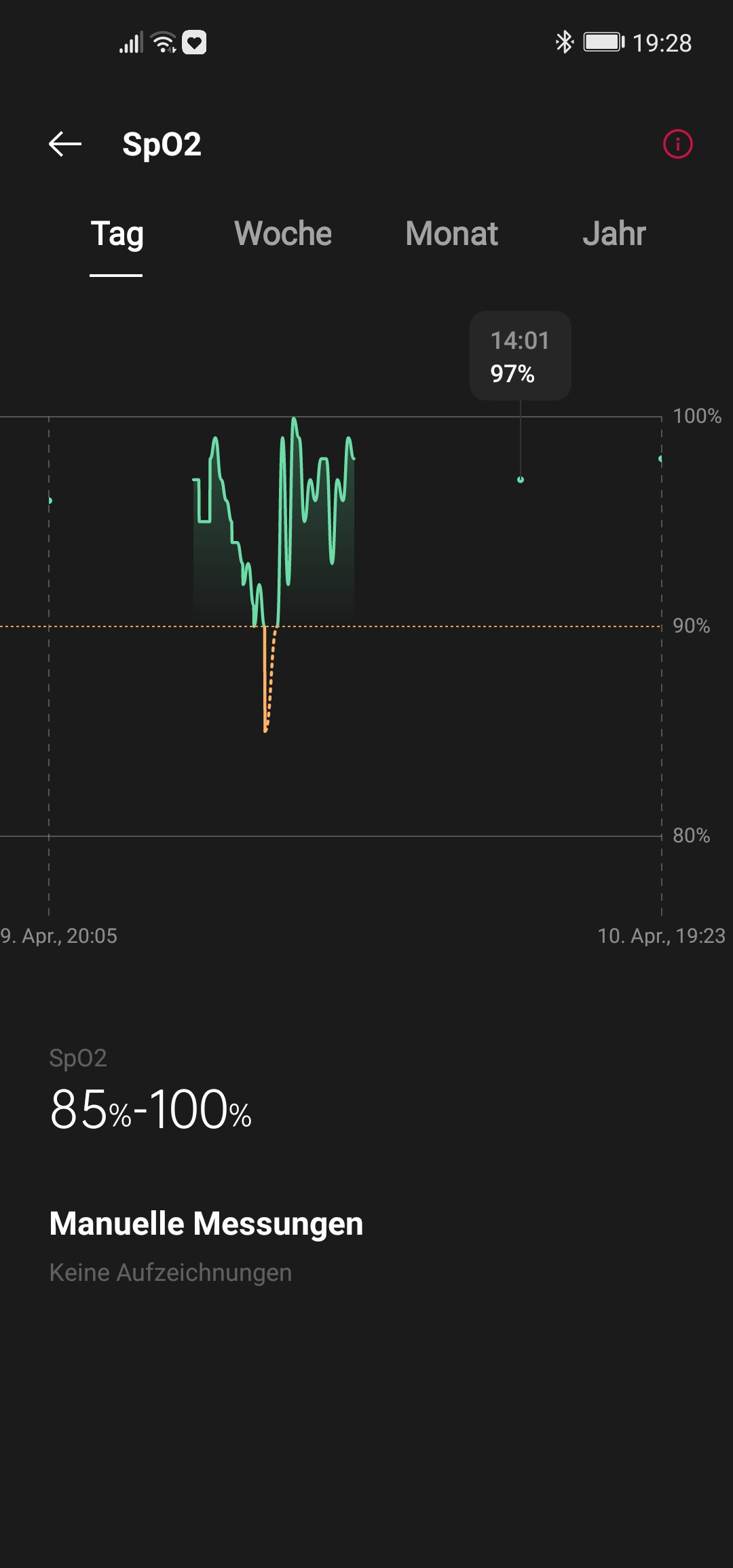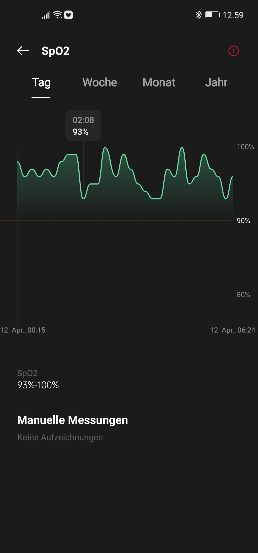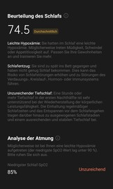 Das Messen der Sauerstoffsättigung des Blutes (SpO2) erfolgt nachts automatisch. Beim zugehörigen Diagramm variiert Skalierung der X Achse wie an den beiden rechten Screens unten zu erkennen: Wenn man die Sättigung tagsüber nicht misst, umfasst sie lediglich nächtliche Aufzeichnung, wie im rechten Screen. Andernfalls erhöht sich die Zeitachse auf 24 Stunden, um die manuellen Messungen zu ergänzen wie im Bild links daneben. Hier stimmt dann allerdings der Hinweis "keine Aufzeichnungen" unter "Manuelle Messungen" nicht.