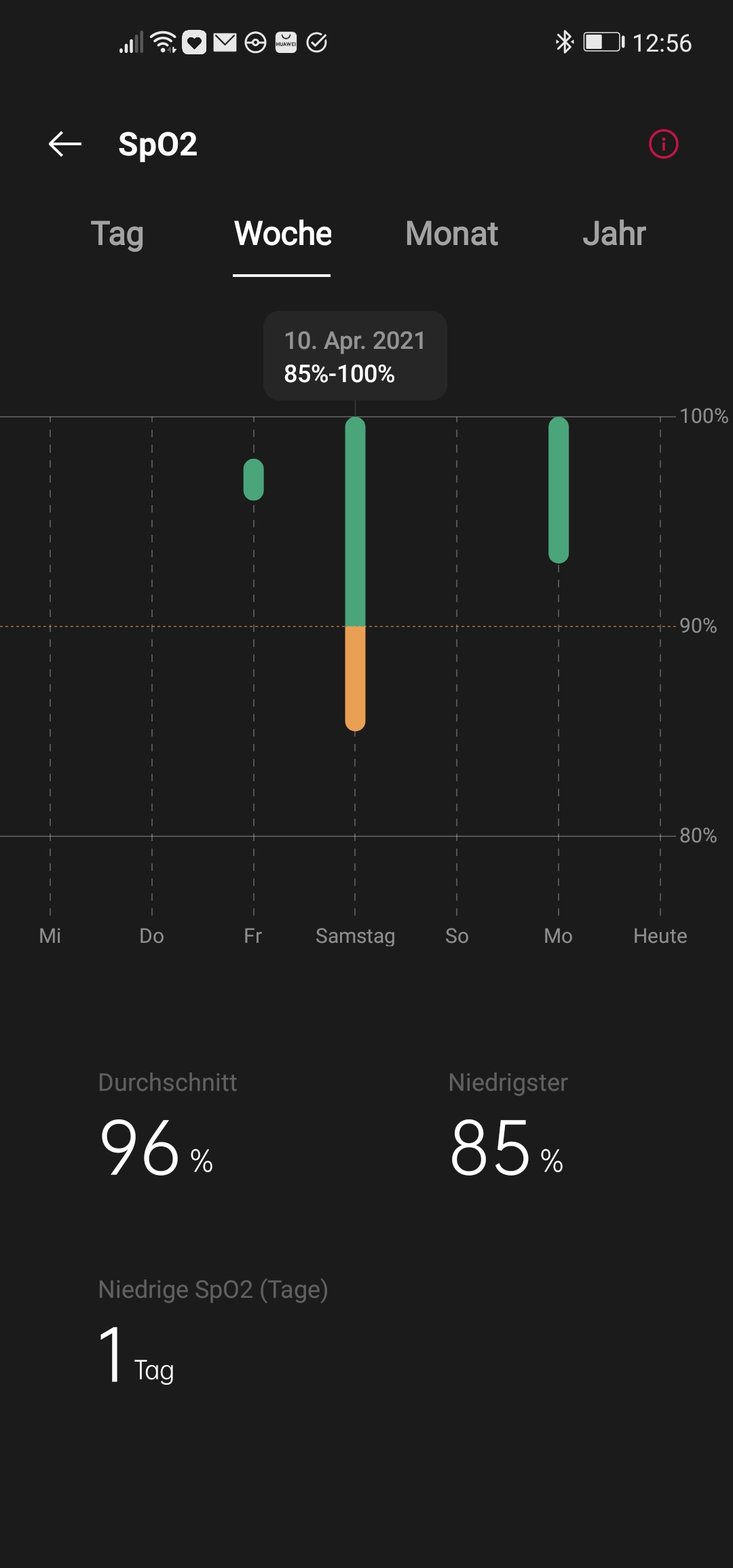 Die Wochen- und Monatsansicht zeigt zusätzlich einen Eintrag "Niedrige SpO2." Ein dediziertes Protokoll über eine niedrige Sättigung finden wir auch bei der Huawei Watch Fit. Während man den Grenzwert dort verändern kann, fixiert ihn OnePlus auf 90 %.