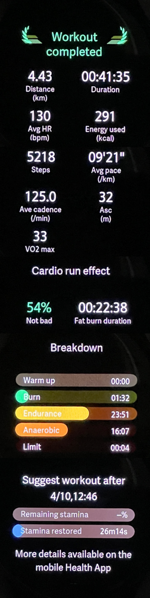 Aktiviert man in der Health-App die automatische Workout-Erkennung, schlägt die Watch beim Laufen vor, die Aktivität zu protokollieren und zeichnet die Route auf. Auf einer 4,68 km langen Standardrunde, die wir mit jedem Fitness-Tracker absolvieren, kam die OnePlus Watch bei einem regulär gestarteten "Fettverbrennungslauf" allerdings mit einer Differenz von 250 m nur auf 4,43 km. Bei anderen Trackern mit integriertem GPS bewegt sich die Abweichung auf der gleichen kurzen Strecke bislang zwischen 30 bis 60 m.