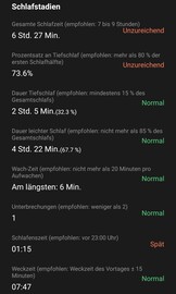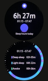 Soweit nachvollziehbar, notiert die Smart Watch sowohl die Einschlaf- und Aufwachezeiten korrekt, als auch kurze nächtliche Wachphasen. Die Watch summiert die Schlafphasen und visualisiert ihren Wechsel anschaulich in einem Kreisdiagramm.