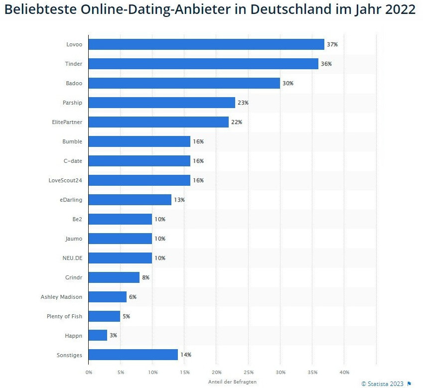 Laut Statista ist die beliebteste Dating-App der Deutschen nicht Tinder, sondern Lovoo. Allerdings ist die Datenbasis mit nur 195 Befragten für diese Aussage mehr als dünn. In der Mini-Umfrage rangiert Lovoo im Spitzen-Trio knapp vor Tinder und Badoo, Parship und ElitePartner machen die Top 5 komplett. Auf den Plätzen sechs bis 10 folgen dann Bumble, C-date, LoveScout24, eDarling und Be2.