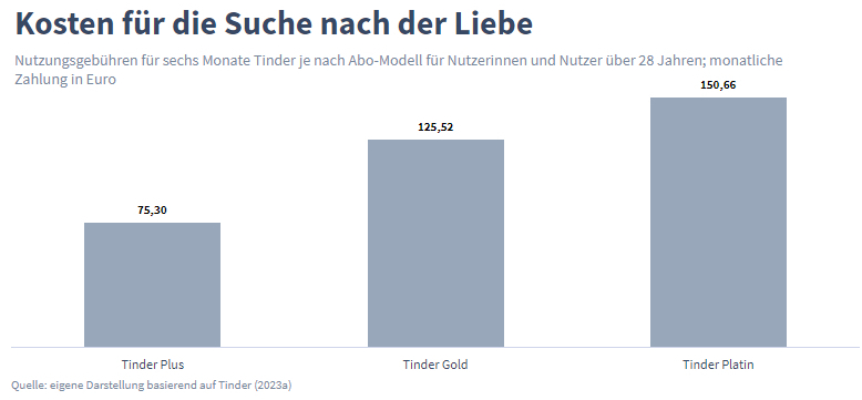 Das Institut der deutschen Wirtschaft Köln (IW) hat in einem Bericht die Kosten für die Suche nach Liebe analysiert. Am Beispiel von Tinder rechnet das IW vor, dass aus 291 Matches über Tinder durchschnittlich eine feste Partnerschaft entsteht. Dafür brauchen Tinder-Nuzterinnen und -Nutzer im Durchschnitt fast ein halbes Jahr. Bei Nutzung der Vorteile der kostenpflichtigen Tinder-Features fallen je nach Abo-Modell dafür zwischen 75,30 bis 151 Euro an.