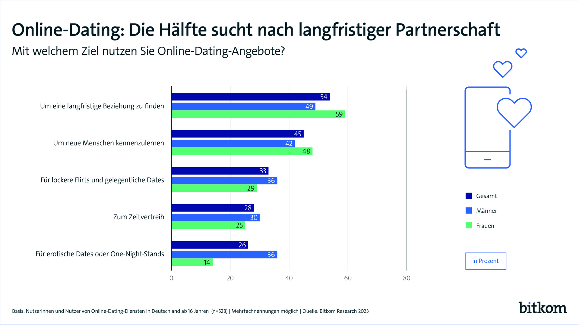 59 Prozent der Frauen suchen eine langfristige Beziehung (Männer: 49 %). Dafür sind mit 36 Prozent Männer fast dreimal häufiger auf der Suche nach erotischen Treffen oder One-Night-Stands als Frauen (14 Prozent). Lockere Flirts und Dates erhoffen sich 36 Prozent der Männer, aber nur 29 Prozent der Frauen. Laut Bitkom haben 29 Prozent der Befragten übers Online-Dating eine feste Partnerschaft gefunden.