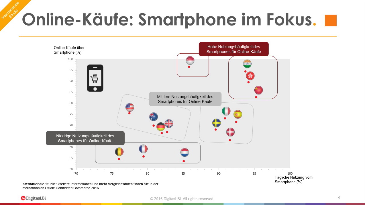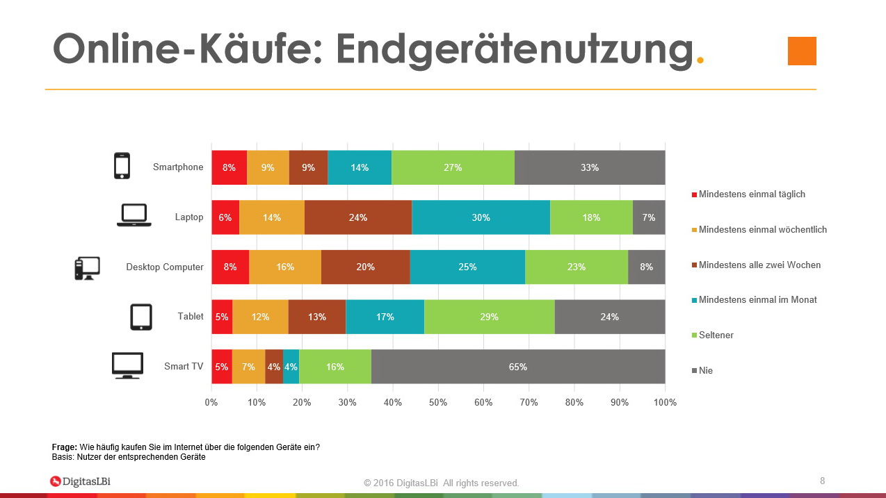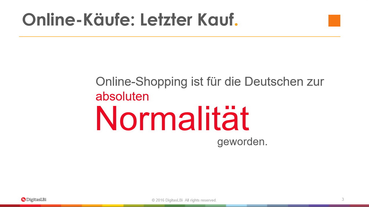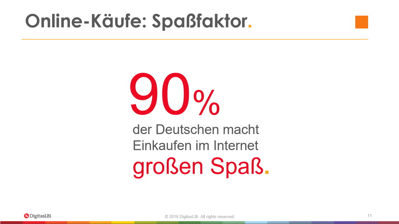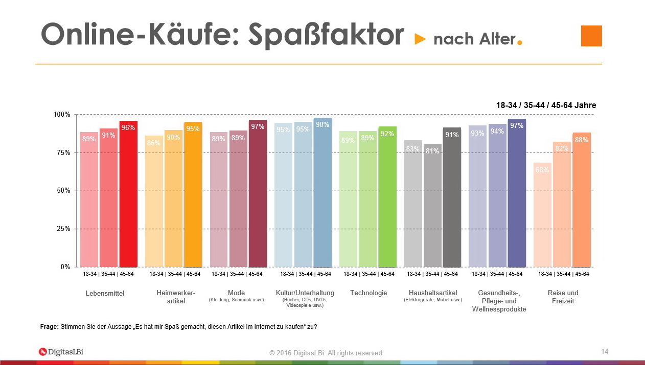 Am Häufigsten kaufen die Internetnutzer in Deutschland diese Tage im Onlineshopping offenbar Modeartikel und Fashionprodukte sowie Kultur- und Unterhaltungsprodukte ein (jeweils 90 Prozent). Im Fall von Modeartikeln sieht die Studie von DigitasLBi als einen zentralen Grund, das kostenfreie Zurückschicken von nicht passender Kleidung und Schuhen. Das unverbindliche Ausprobieren von online gekauften Artikeln nimmt für viele Verbraucher einen vergleichbaren Stellenwert ein, wie die klassische Umkleidekabine. Das meiste Entwicklungspotenzial besitze gemäß DigitasLBi der Onlinehandel mit Lebensmitteln.