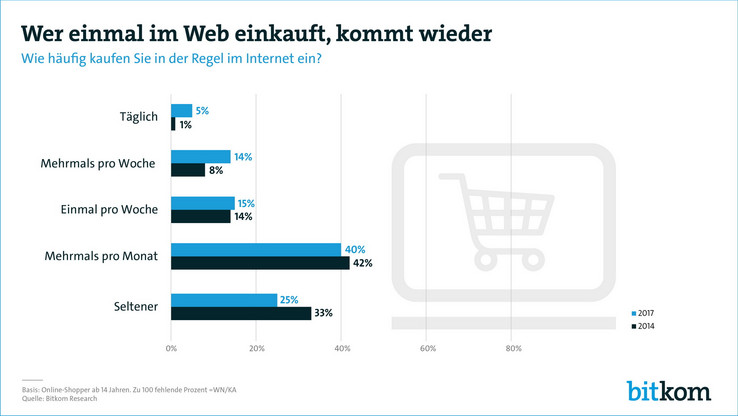 Immer mehr Deutsche shoppen mehrmals die Woche online im Internet. Das hat eine repräsentative Befragung im Auftrag des Digitalverbands Bitkom ergeben. 5 Prozent der Onlineshopper kaufen bereits täglich im Internet ein. Im Jahr 2014 taten dies erst 1 Prozent. 14 Prozent der Deutschen kaufen sogar mehrmals pro Woche online ein (2014: 8 Prozent) und 15 Prozent einmal pro Woche (2014: 14 Prozent). Insgesamt gesehen kaufen 19 Prozent (2014: 9 Prozent) mehrmals pro Woche online ein.