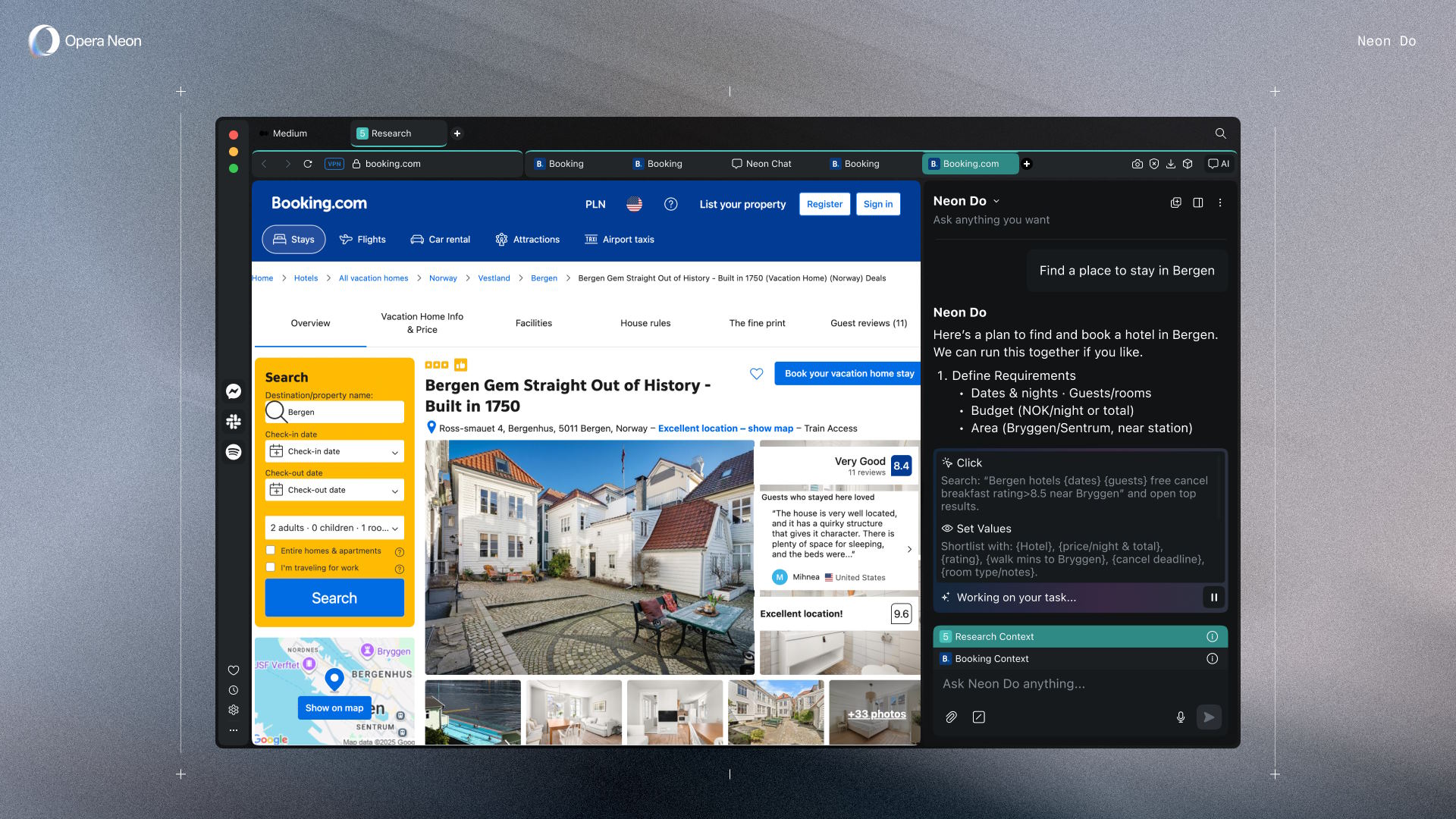 Der Neon-Agent selbst ist sozusagen dreigeteilt, so lassen sich mithilfe der drei Browser-Funktionen Chat, Do und Make beispielsweise auch umfangreiche Aufgaben von dem Agenten durchführen - im Prinzip ist es damit möglich, dem Browser im besten Fall komplett die Buchung einer Reise oder den Kauf eines Blumenstraußes zu überlassen. Dokumente können ebenfalls im Browser bearbeitet werden, damit können Ergebnisse einer Recherche gleich übersichtlich und einfach bearbeitbar aufbereitet werden.