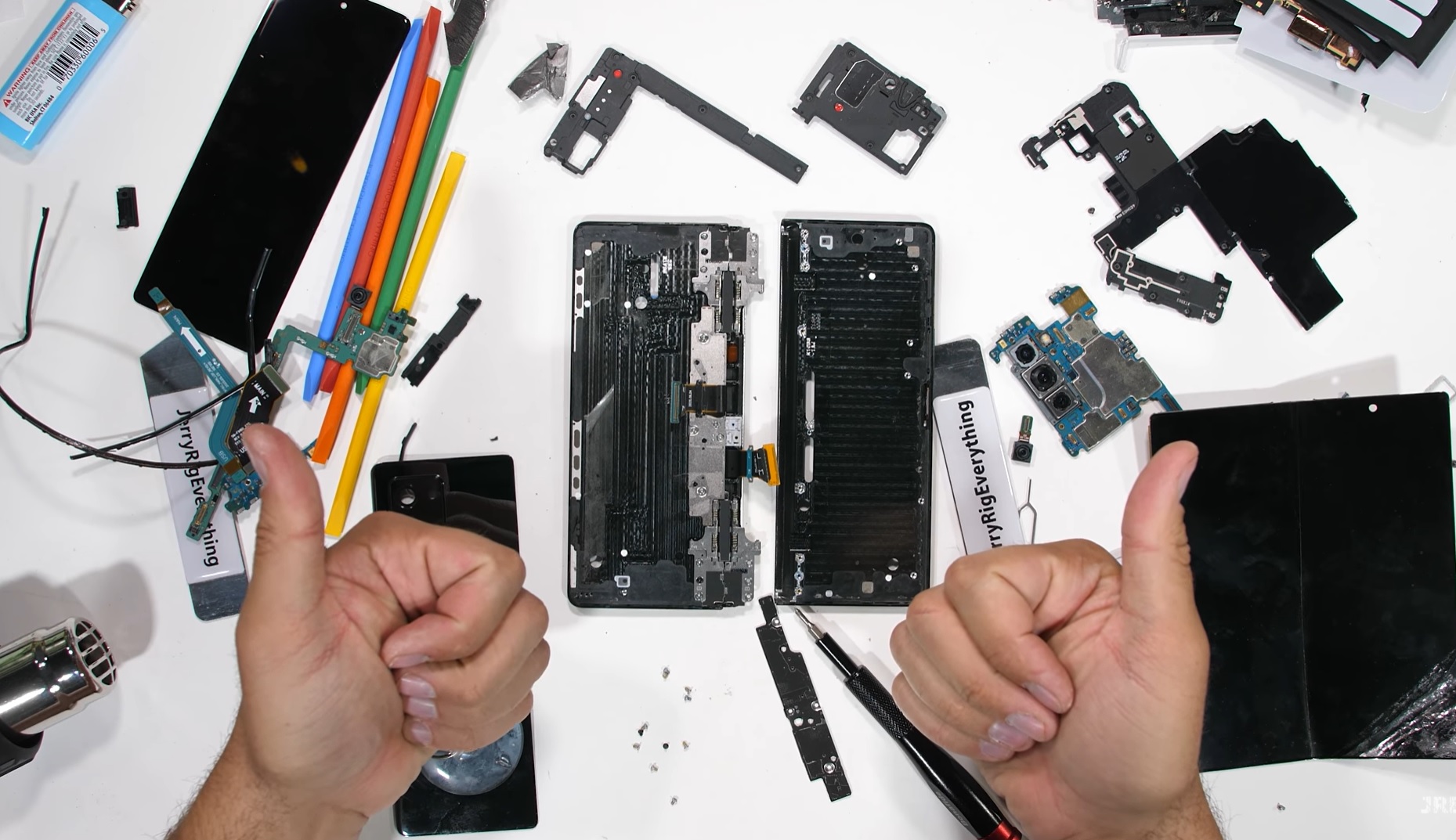 Einem Teardown des Galaxy Z Fold2 5G konnte man bereits beiwohnen, der war allerdings im Vergleich zur JerryRigEverything-Variante deutlich nüchterner. Wer erleben will, wie sich das flexible AMOLED-Display verhält, wenn der Schutzwall rund herum entfernt, das Display vorsichtig vom Chassis getrennt und die ultradünne Glasschicht vom Panel entfernt wird - der sollte unten zuschauen.