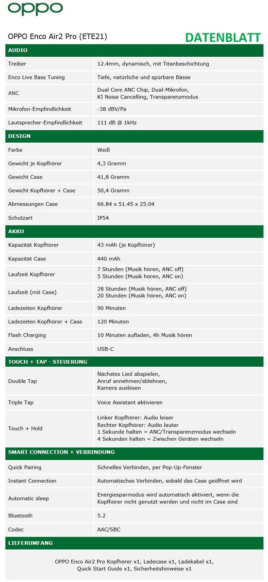 Zum Lieferumfang, der je Earbud 4,3 g leichten und gemäß IP53 staub- und wasserdichten Enco Air2 Pro, zählt ein Ladecase im abgerundeten, teiltransparenten Gehäuse und ergonomische Ohrstöpsel für hohen Tragekomfort. Oppo verspricht für seine ANC-Earbuds eine Akkulauf von bis zu 28 Stunden. Ohne Ladecase sollen bis zu 7 Stunden drin sein. Dank Oppo Flash Charging lassen sich die Enco Air2 Pro mit 10 Minuten Ladezeit für 2 Stunden Hör-Genuss aufladen.