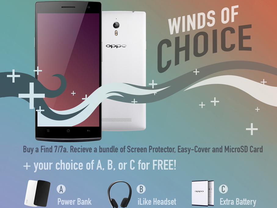 Oppo Winds of Choice Promotion: Vom 22. September bis zum 12. Oktober legt Oppo beim Kauf eines Smartphones Oppo Find 7a oder Oppo Find 7 neben einem kostenlosen Find 7 Easy Cover, einer Displayschutzfolie und einer microSD-Speicherkarte mit 32 GByte auch eines der folgenden 3 Produkte als Zubehör für lau in den Karton: