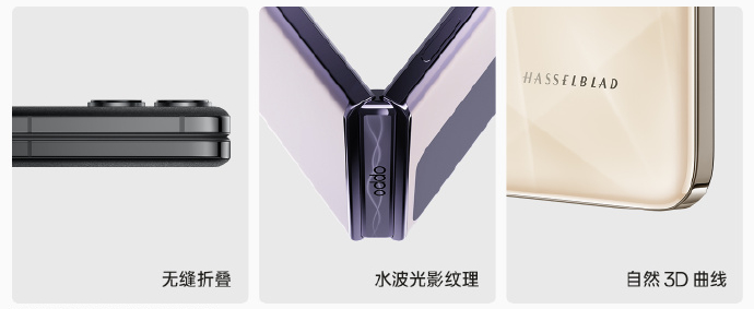 Oppo verspricht eine Spitzenhelligkeit von 1.600 Nits. Das AMOLED-Display auf der Außenseite fällt mit einer Diagonale von 3,26 Zoll deutlich größer aus als bei der Konkurrenz, wodurch dieses deutlich nützlicher sein soll, etwa als Sucher für die Kamera, zur Anzeige von QR-Codes, etwa für Boarding-Pässe, oder auch für die Nutzung ganzer Apps. Oppo verbaut eine 50 Megapixel Hauptkamera mit einem Sensor im 1/1,67 Zoll Format, der eine 12 MP Ultraweitwinkel-Kamera zur Seite gestellt wird. Das Hasselblad-Branding wird dezent an der unteren Hälfte der Rückseite angebracht.
