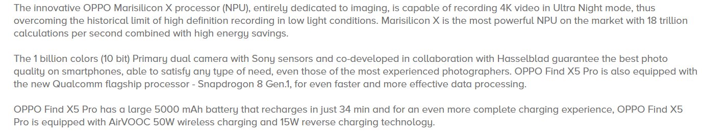 Erfreulich ist, dass die rückseitige Triple-Cam in beiden Modellen tatsächlich identisch sein dürfte und sowohl Hasselblad-Tuning als auch den speziellen MariSilicon-ISP/NPU integriert haben. In den Beschreibungen unten wird auch jeweils der Ultra Nightmode für 4K-Video erwähnt, was Oppo dieser Tage auch bereits mit dem Hashtag #SavetheNight in Teasern bewirbt. Einige weitere Kamera-Features werden beim Find X5 explizit erwähnt, etwa 10 bit Video und Photo sowie die Hasselblad-Filter.