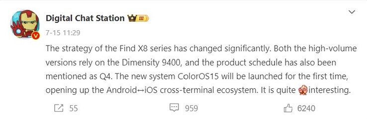 Erstmals setzt offenbar auch Oppo auf Mediatek als zunehmend populärer werdende Alternative zu Qualcomm, wohl vor allem aus Kostengründen. Dem Leaker zufolge wird das Find X8 und das Find X8 Pro mit Dimensity 9400 starten, nur das Find X8 Ultra dürfte den Snapdragon 8 Gen 4 zu bieten haben - womit wir eine eindeutige Parallele zu Vivos Flaggschiffen der X-Serie haben. Das potentiell bereits auf Android 15 basierende Color OS 15 soll zumindest in China besser mit Apples iPhones kommunizieren können und etwa AirDrop unterstützen.