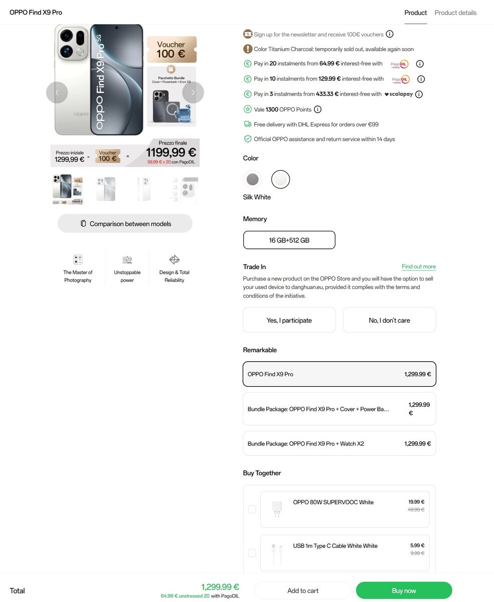 In Frankreich gibt es aktuell zwar keinen Rabatt-Code, hier bekommen Vorbesteller aber ebenfalls die Oppo Watch X2 gratis zum Oppo Find X9 Pro dazu, das hier ebenfalls zeitnah verschickt wird. In den Benelux-Ländern kann man traditionell am leichtesten direkt mit Versand nach Deutschland bestellen, auch beim Oppo Find X9 Pro ist das bereits möglich. Dort finden wir allerdings keine ähnlichen Vorbesteller-Aktionen sondern nur ein Bundle-Angebot mit gratis Enco Air4 Pro Earbuds und dem Supervooc 80 Watt Ladegerät.