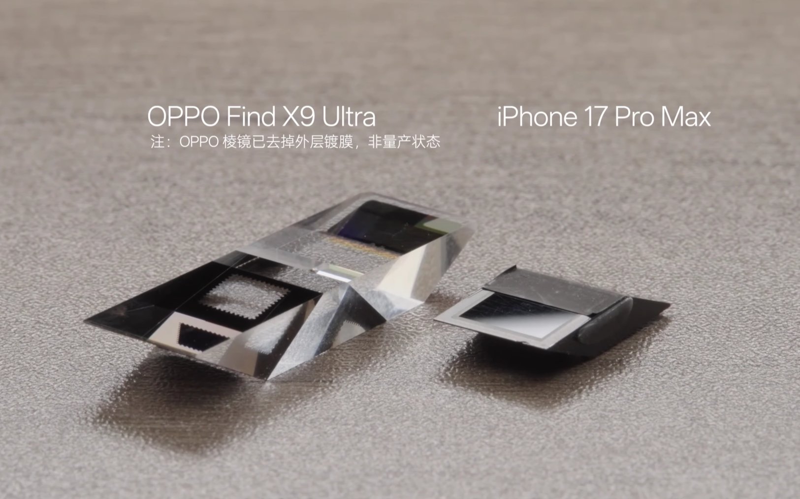 Im Video wird recht lange erklärt, wie das neue 10x Telefoto im Detail funktioniert, was allerdings bereits früher mal Thema war. Interessant ist hier aber auch ein Größenvergleich des neuen Telefoto-Moduls mit dem größten bisher von Samsung genutzten 10 Megapixel 1/3.24 Zoll 10x Periskop-Modul im Galaxy S21 Ultra. Jenes im Galaxy S23 Ultra war mit 1/3.54 noch eine Spur kleiner. Beim Oppo Find X9 Ultra kommt dagegen ein 1/2.75 Zoll ISOCELL JNL (modifizierter JN5) mit F/3.5 Blende zum Einsatz, der 170 Prozent mehr Licht als das Modul des Galaxy S21 Ultra einfangen soll. So nebenbei wird im Video auch das vergleichsweise riesige Spiegelmodul dem Tetraprisma im 5x Telefoto des iPhone 17 Pro Max gegenübergestellt.