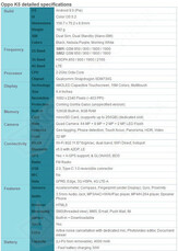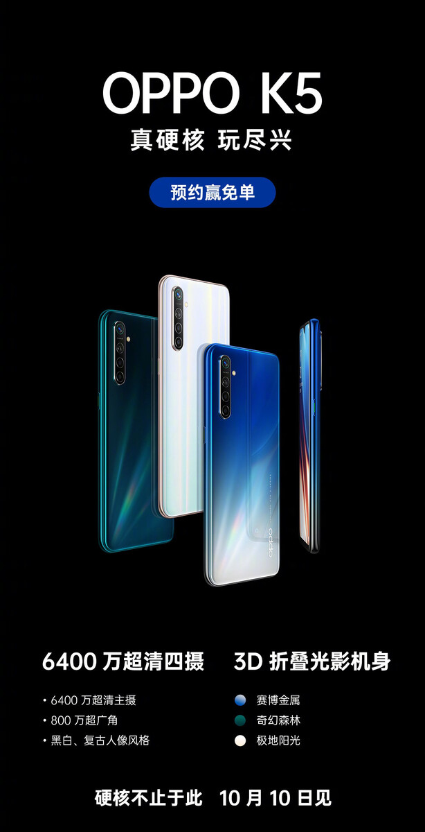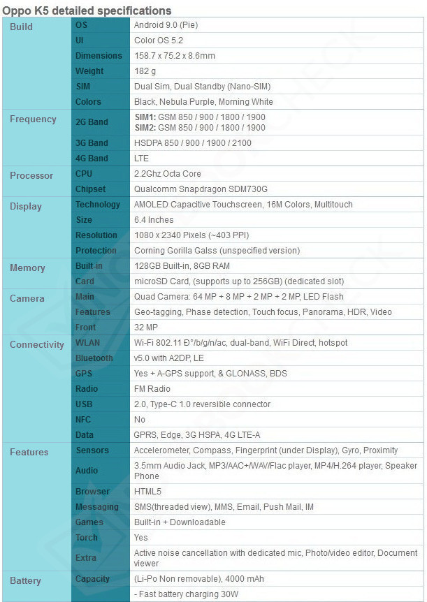 Als Prozessor arbeitet im Oppo K5 ein Qualcomm Snapdragon 730G, der von 8 GB RAM und 128 GB internem Speicher unterstützt wird. Das 6,4-Zoll-AMOLED-Display bietet eine FHD+-Auflösung von 2.340 x 1.080 Pixeln. Neben einer 64-MP-Quad-Kamera (64/8/2/2 MP) mit PDAF an der Rückseite bietet das Oppo K5 vorne eine 32-MP-Selfiecam. Das Oppo K5 wird in Indien vermutlich zu einem Preis von rund 18.000 Rupien (232 Euro) angeboten.