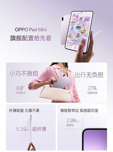 Das Tablet fällt mit einer Bauhöhe von 5,39 Millimetern und einem Gewicht von 279 Gramm relativ dünn und leicht aus, die Bildschirmränder sind mit 2,99 Millimeter auf allen vier Seiten gleichmäßig dünn. Das 8,8 Zoll Display basiert auf einem OLED-Panel, das QHD-Auflösung und eine Bildfrequenz von 144 Hz erzielt. Der Akku fasst 8.000 mAh, und soll eine Laufzeit von bis zu 19,5 Stunden Videowiedergabe ermöglichen.