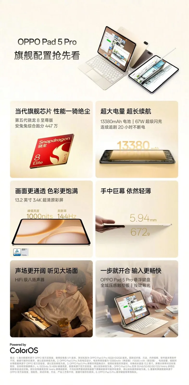 Das Oppo Pad 5 Pro fällt mit einem 13,2 Zoll Display wesentlich größer aus, wobei Oppo einen Bildschirm mit 3,4K-Auflösung, einer Bildfrequenz von 144 Hz und einer beachtlichen Helligkeit von 1.000 Nits verbaut. Obwohl das Tablet mit einer Bauhöhe von 5,94 Millimetern und einem Gewicht von 672 Gramm vergleichsweise dünn ist, kann Oppo einen gigantischen 13.380 mAh Akku verbauen, der eine Laufzeit von 20 Stunden erreichen soll und der über USB-C mit bis zu 67 Watt geladen werden kann.
