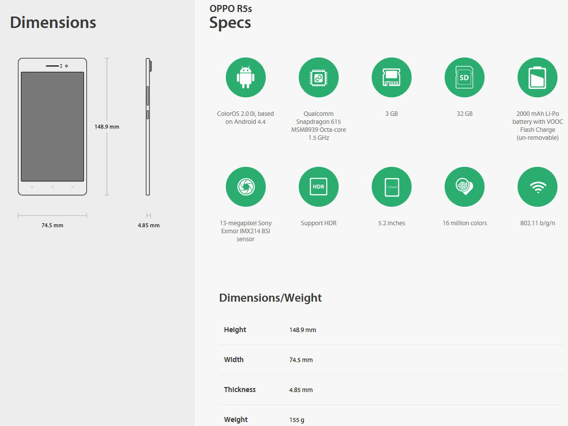 Das Oppo R5s arbeitet wie das R5 ansonsten mit einem 64 Bit Qualcomm Snapdragon 615 MSM8939 8-Kern-Prozessor (1,5 GHz) und verfügt über ein 5,2 Zoll großes AMOLED-Display mit Full-HD-Auflösung (1920 x 1080 Pixel, 423 ppi). Als Kameras sind eine 13-MP-Hauptkamera mit Sony Exmor IMX214 Bildsensor an der Rückseite und eine 5-MP-Weitwinkelkamera vorne für Selfies vorhanden. Der Akku des Superflachmanns hat eine Kapazität von 2000 mAh.