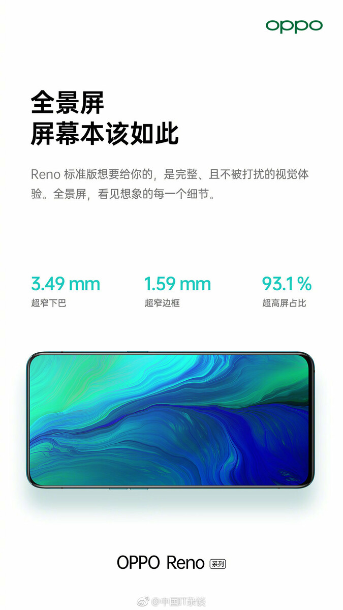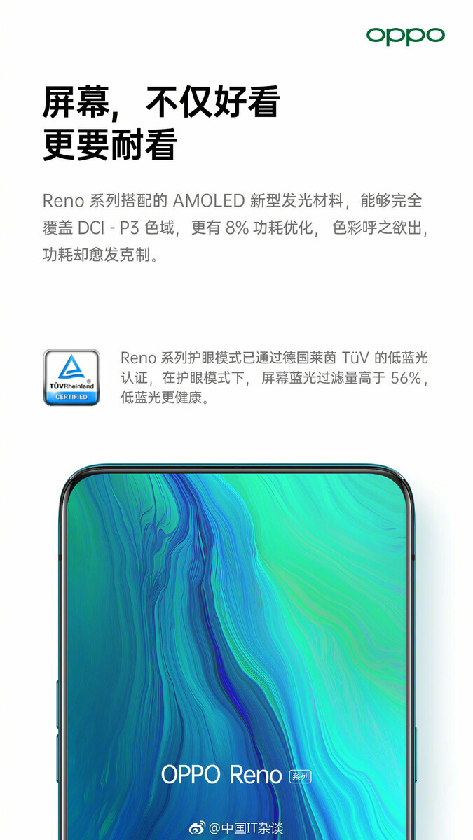 Was können wir den Bildern noch entnehmen? Nun, optische Bildstabilisierung und eine HDR-Funktion wird das Oppo Reno ebenfalls aufweisen, dazu eine Ultra-Low-Light-Funktion, die bereits vorab angeteasert wurde und wohl primär durch den größeren Sensor mit F/1.7 Blende realisiert werden soll. Beim absolut notch- und lochfreien Display mit ausklappbarer Selfie-Cam im ungewöhnlichen Design will Oppo gegenüber dem Huawei P30 Pro mit den dünneren Rändern, 93,1 Prozent Screen-to-Body-Ratio sowie TÜF-zertifiziertem DCI-P3-AMOLED-Panel punkten.
