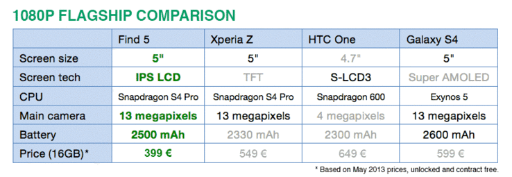 Mit dem Find 5 schickt Oppo einen interessanten Konkurrenten gegen das HTC One, Galaxy S4 von Samsung und das Sony Xperia Z in das Rennen um die Käufergunst bei den Top-Smartphones. Von den technischen Daten her muss sich das Oppo Find 5 sicher nicht vor Galaxy S4 und Co. verstecken: Qualcomm APQ8064 Quad-Core mit 1,5 GHz, 5 Zoll Full-HD-Touchscreen mit 1.920 x 1.080 Pixeln und 441 ppi, eine 13-MPixel-Hauptkamera, Bluetooth, NFC und ein Akku mit 2.500 mAh.