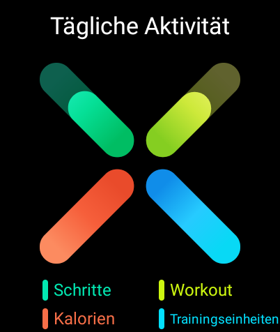Mehrere Ziffernblätter übernehmen die Information in ihre Anzeige, allen voran das nach der Installation eingestellte Standardzifferblatt, das die vier Tagesziele in einem gleichschenkligen X visualisiert.