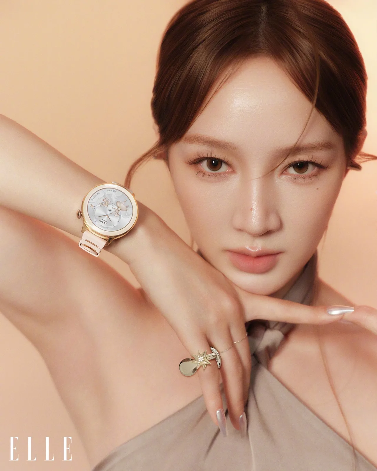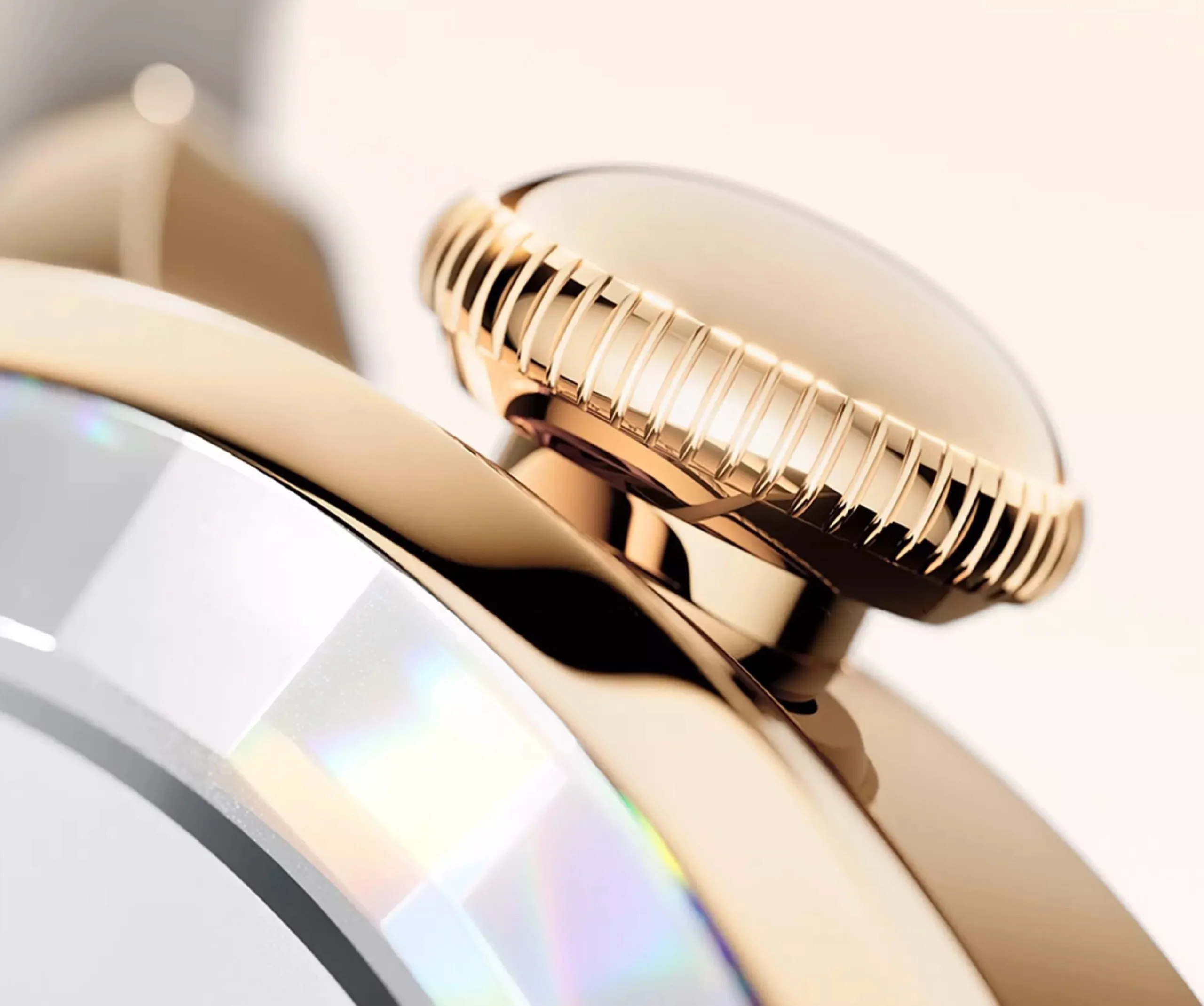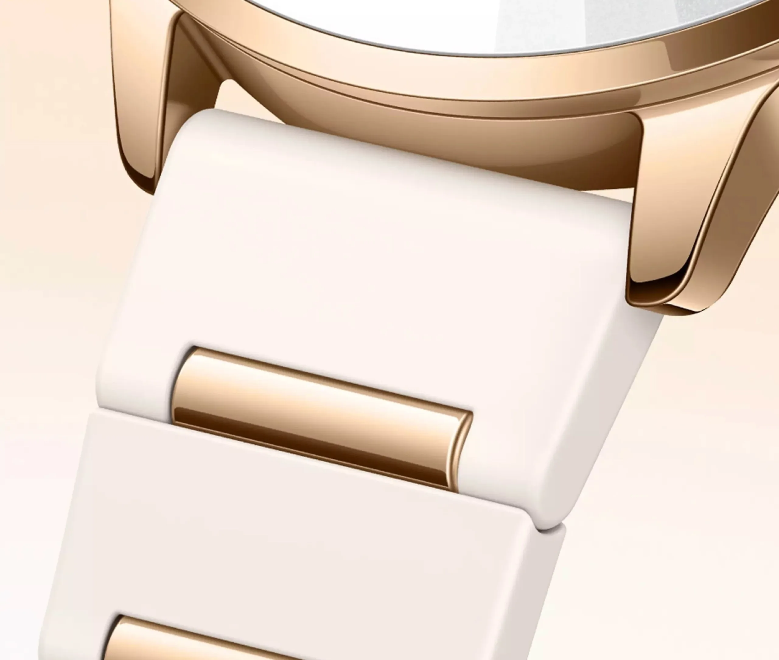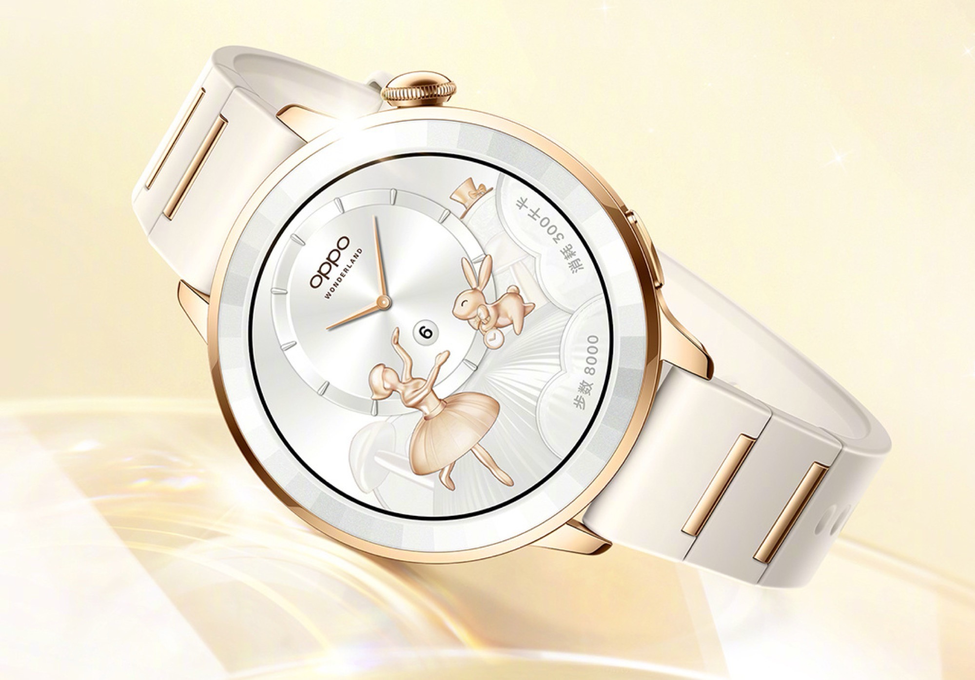 Die goldene Version der Smartwatch setzt auf ein hochwertiges Edelstahlgehäuse, das mit 18-karätigem Gold vergoldet wird. Die digitale Krone weist ein auffälliges, nach außen gewölbtes Design auf, das runde AMOLED-Display wird durch kratzfestes Saphirglas geschützt. Oppo kombiniert die Smartwatch mit einem auffälligen, hellgrauen Armband mit goldenen Farbakzenten.