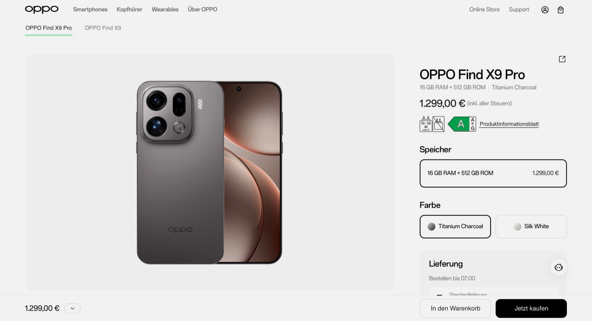 Das ändert sich nun, seit wenigen Tagen ist eine neue Webseite von Oppo Deutschland verfügbar, die Produktinformationen enthält, und über die einige Smartphones sogar verkauft werden, darunter das Oppo Find X9 und das Find X9 Pro. Da Oppo die meisten Smartphones zum Listenpreis anbietet, empfiehlt sich dringend, vor dem Kauf einen Preisvergleich zu konsultieren. Denn während das Oppo Find X9 Pro direkt beim Hersteller 1.299 Euro kostet, ist dasselbe Smartphone im Preisvergleich schon 100 Euro günstiger zu finden.