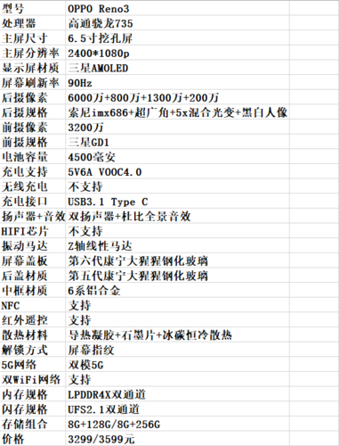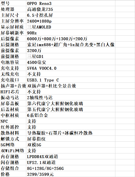 Die 32 Megapixel Selfie-Cam steckt offenbar im hier nicht sichtbaren linken oberen Displaybereich, an der Rückseite kündigt sich vermutlich eine Quad-Cam mit 60 Megapixel Sony IMX686 Hauptkamera, 8 Megapixel Telefoto-Cam mit 5x-Hybrid-Zoom, 13 Megapixel Ultraweitwinkel-Optik und 2 Megapixel Tiefenshooter an. Ein echtes Flaggschiff wird das Oppo Reno 3 Pro 5G vermutlich nicht, denn als Mobilprozessor arbeitet offenbar ein Snapdragon 735 mit 8 GB RAM und 128 oder 256 GB UFS 2.1 Speicher. Stimmen die Leaks, dann steckt zudem ein 4.500 mAh Akku mit 30 Watt VooC-Charging drin, das alles um gemunkelte 430 bis 470 Euro.