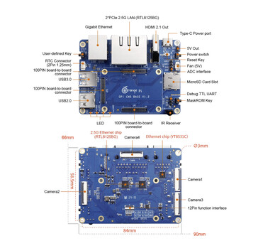 Der Arbeitsspeicher misst je nach Modellvarianten 2, 4, 8 oder 16 Gigabyte, der eMMC-Speicher ist zwischen 32 und 256 Gigabyte groß. Über drei Anschlüsse mit jeweils 100 Pins lassen sich zahlreiche Anschlüsse abgreifen.