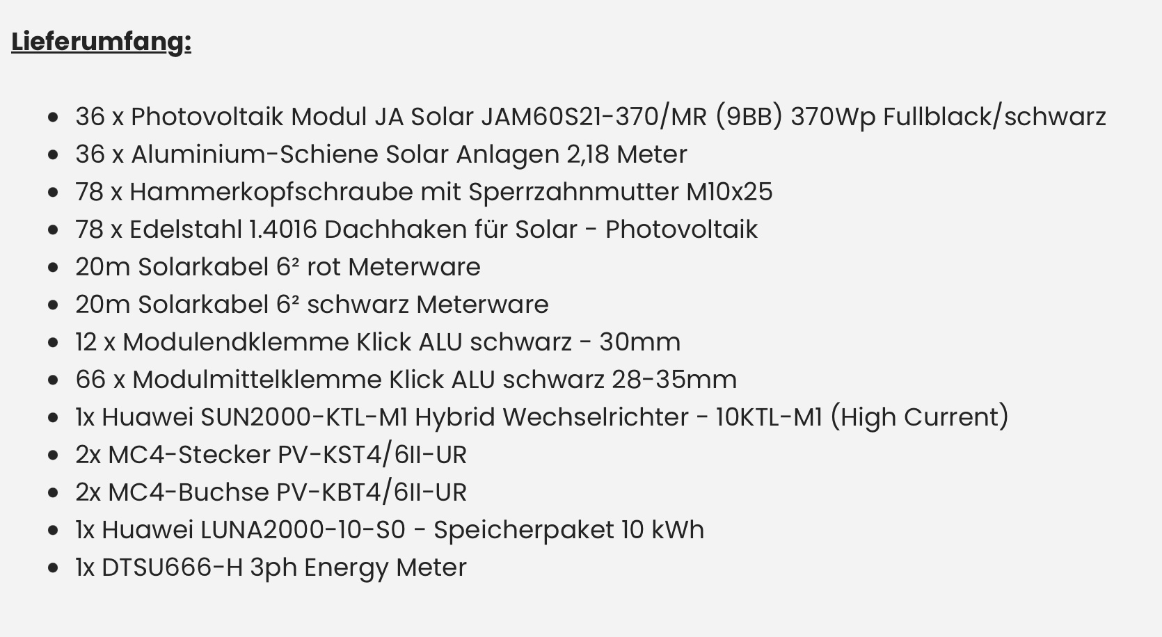 Des Weiteren ist die PV-Anlage mit 36 Solarmodulen JAM60S21-370 von Ja Solar à 370 Wp mit einem Wirkungsgrad von 19,9 Prozent ausgestattet und enthält neben Zubehör auch Montagematerial. Allerdings kann es je nach Art der Befestigung notwendig sein, dass man weiteres Zubehör hinzukaufen muss, doch auch dann ist es ein guter Deal.