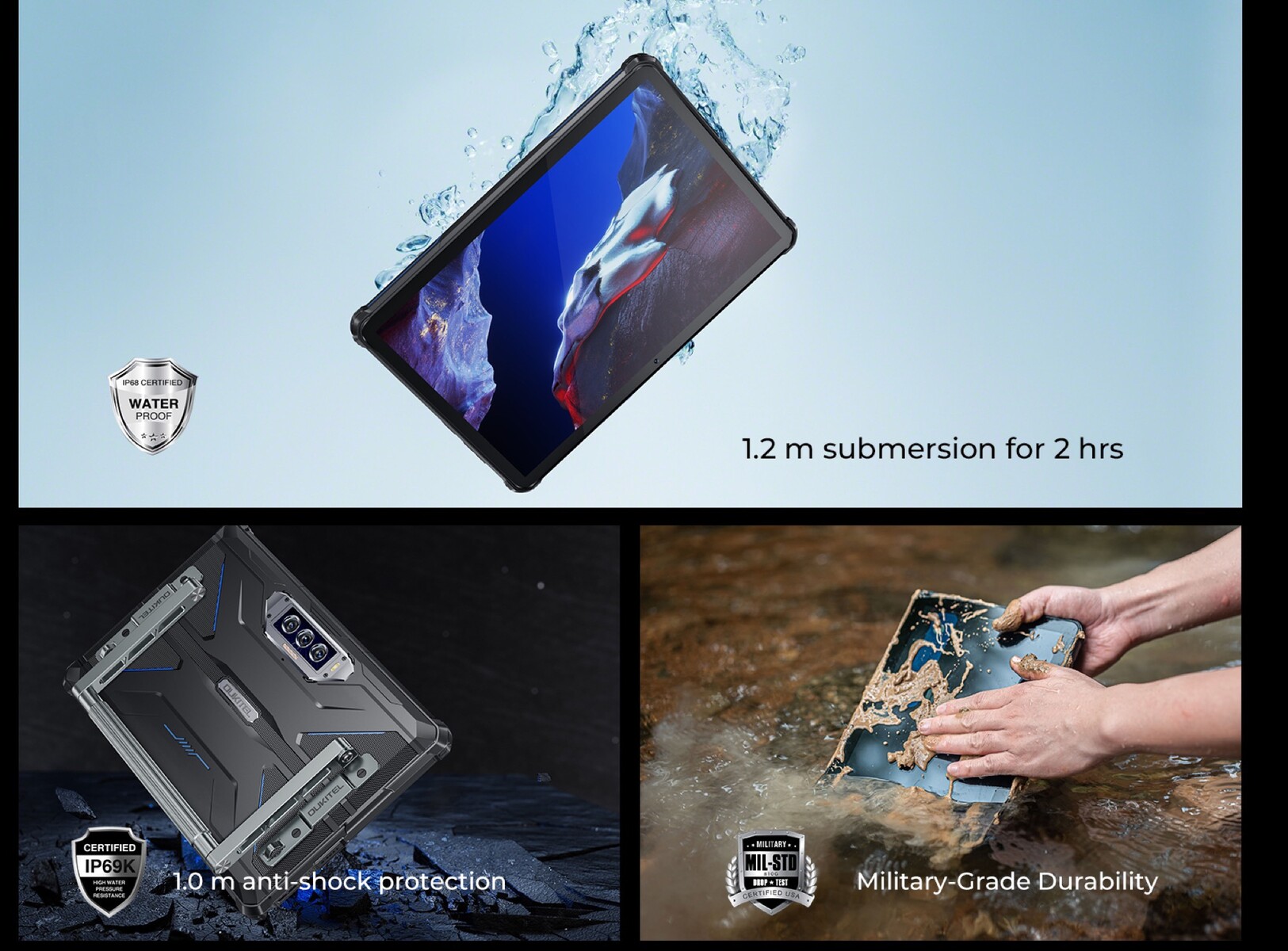 Oukitel verbaut eine 32 Megapixel Selfie-Kamera, eine 48 MP Hauptkamera, eine 20 MP Nachtsicht-Kamera und einen 2 MP Sensor. Das Gehäuse des Tablets ist nach IP68, nach IP69K und nach MIL-STD 810H zertifiziert, wodurch das Gerät bis zu einer Tiefe von 1,2 Metern wasserfest sowie gegen Staub und gegen Stürze aus einer Höhe von bis zu einem Meter geschützt sein soll. Auf der Rückseite kann wahlweise ein Handgriff oder ein Schultergurt montiert werden. Das Oukitel RT7 Titan wird mit Android 13 ausgeliefert.