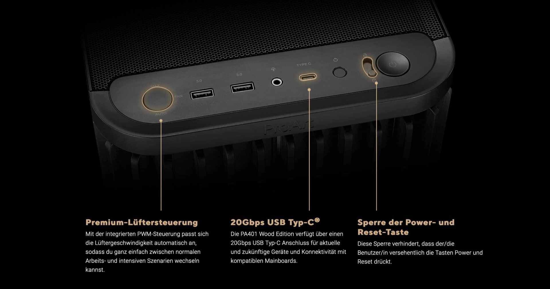 Durch zwei 160 Millimeter Lüfter, die sich unter der Holz-Front verstecken, und einen 120 Millimeter Lüfter an der Rückseite soll das Gehäuse einen idealen Luftstrom zur Kühlung leistungsstarker Hardware erzielen. Am vorderen Ende der Oberseite finden sich zwei USB-A-Ports, ein USB-C-Anschluss, der Datenraten bis 20 Gibt/s erreicht, ein 3,5 mm Kopfhöreranschluss, ein Lüfter-Boost-Button und der Einschaltknopf, der gesperrt werden kann, um versehentliches Abschalten zu verhindern.