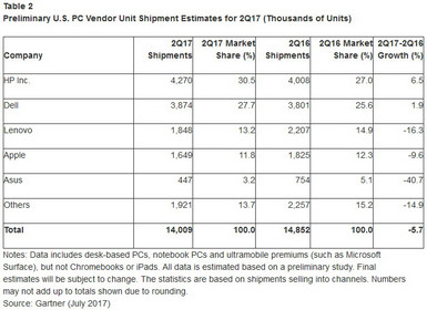 Damit befindet sich die globale PC-Branche in einem schon 5 Jahre andauernden Rückgang, so das IT-Research und Beratungsunternehmen Gartner. Gemäß Gartner ist dies nun das 11. Quartal in Folge mit sinkenden Auslieferungszahlen für Personal Computer. Die Zahl der Auslieferungen im zweiten Quartal diesen Jahres war die niedrigste seit dem Jahr 2007.