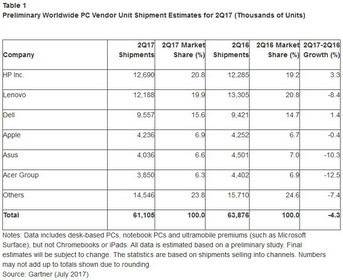 IDC hat heute bereits seine Einschätzung zum globalen PC-Markt im zweiten Quartal 2017 abgegeben. Im Vergleich dazu sehen die Analysten von Gartner den PC-Markt in Q2/2017 etwas schwächer: In der Gartner-Statistik liegt das weltweite PC-Absatzvolumen im 2. Quartal 2017 mit 61,105 Millionen Geräten zwar etwas höher als bei IDC, allerdings entsprechen diese Zahlen bei Gartner einem Rückgang von 4,3 Prozent gegenüber dem zweiten Quartal 2016 (IDC: -3,3 %).
