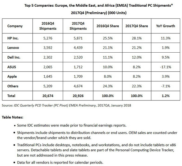Der traditionelle PC-Markt verzeichnete in EMEA (Europa, Naher Osten und Afrika) bei den klassischen PCs (Desktops, Notebooks und Workstations) im vierten Quartal 2017 ein leichtes Wachstum. Der Markt entwickelte sich leicht positiv (+1,2 %) und erreichte ein Absatzvolumen von insgesamt 20,9 Millionen Einheiten. Notebooks entwickelten sich in EMEA (+2,1 %) positiv, wobei die Region MEA besonders stark zulegte (+12,1 %). Auch der Absatz von Desktops blieb in EMEA - quer durch alle Regionen - vergleichsweise stabil (-0,8 %).
