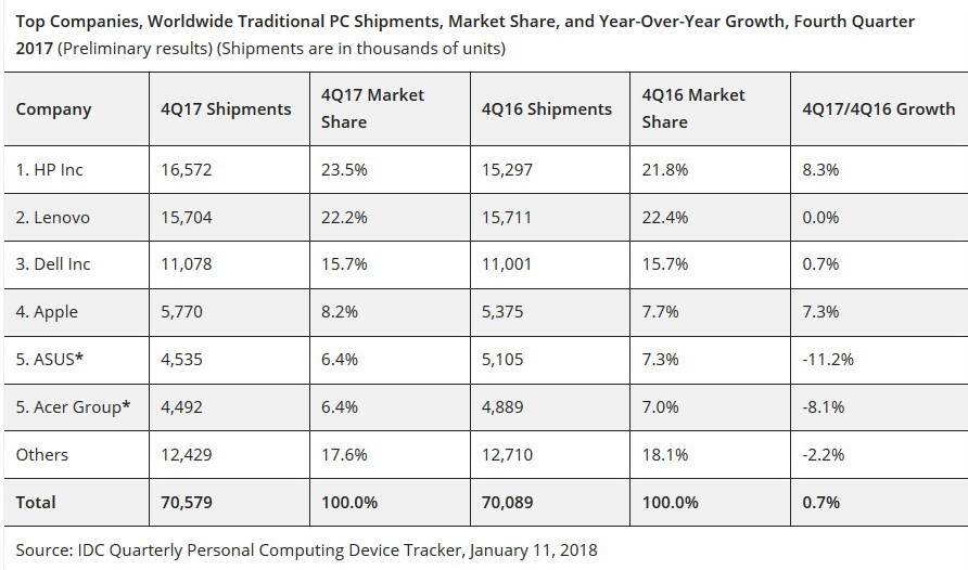 Im vierten Quartal 2017 belief sich das weltweite Liefervolumen traditioneller PCs (Desktop, Notebook und Workstation) auf 70,6 Millionen Einheiten und verzeichnete damit ein leicht positives Wachstum (0,7 Prozent) gegenüber dem Vorjahr. Laut IDC übertrafen die Ergebnisse die zuvor gemachten Prognose deutlich, in der mit einem deutlichen Rückgang des Absatzvolumens gerechnet wurde.