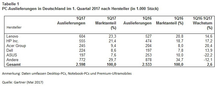 Das IT-Research- und Beratungsunternehmen Gartner berichtet, dass im ersten Quartal 2017 rund 2,6 Millionen PCs in Deutschland ausgeliefert wurden. Gartner zufolge entspricht das einem Zuwachs von 2,6 Prozent gegenüber dem ersten Quartal 2016 und einem saisonal üblichen Rückgang von 19 Prozent im Vergleich zu Q4/2016. Die Nachfrage nach PCs im westeuropäischen Markt sei insgesamt um 3 Prozent gesunken. Hier hatte der Marktabsturz um 17 Prozent in Großbritannien einen signifikanten Einfluss. Der PC-Markt in Frankreich ging im Vergleich zum Vorjahr um 1 Prozent zurück.