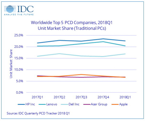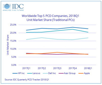 HP behauptete sich auf Platz 1 gegenüber den anderen PC-Herstellern mit einem Wachstum zum achten Male in Folge. HP wuchs um plus 4,3 Prozent im Vergleich zum Vorjahr (Q1/2017). Für HP gab es ein Absatzplus in allen Regionen mit Ausnahme von Lateinamerika. Lenovo (2) verzeichnete in Q1/2018 ein "flaches" Quartal ohne Veränderungen. Dell (3) hingegen konnte sein Wachstum um 6,4 Prozent forcieren. Acer bleibt auf Position 4. Die kontinuierliche Erweiterung des Angebots im Bereich Gaming und Chromebooks haben sich für Acer ausgezahlt. Apple beendete das Quartal auf dem fünften Platz mit einem Rückgang von 4,8 % gegenüber dem Vorjahr.