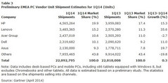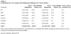 Lenovo konnte im Jahresvergleich um 10,9 Prozent zulegen und kam im 1. Quartal 2014 auf einen Marktanteil (MA) von 16,9 Prozent. Hewlett-Packard (HP) beansprucht mit plus 4,1 Prozent und 16 Prozent Marktanteil den 2. Platz. Dahinter auf Position 3 folgt Dell mit einem Plus von 9 Prozent (12,5 % MA). Für Acer auf Rang 4 ging es mit einem zweistelligen Minus von fast 15 Prozent (7,3 % MA) weiter abwärts. Asus (Pos. 5) holte mit einem Absatzplus von 4,8 % auf und ist mit einem Marktanteil von 6,9 Prozent schon in Schlagweite zu Acer.
