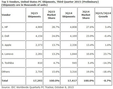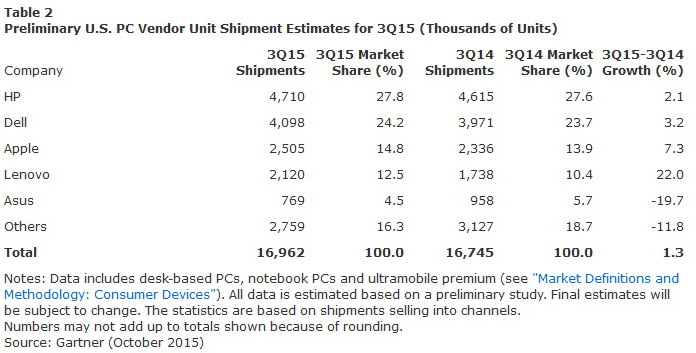 Während IDC für alle Top-5-Hersteller rückläufige Lieferzahlen ausweist, tippeln Dell und Apple bei der Absatzentwicklung in der Beurteilung von Gartner zumindest auf der Stelle. Einigkeit herrscht zwischen Gartner und IDC allerdings wieder bei Acer. Beide Analysten sehen Acer als den großen Verlierer im 3. Quartal 2015 mit einem um 19,9 Prozent respektive 25,9 % gesunkenen Absatzvolumen.