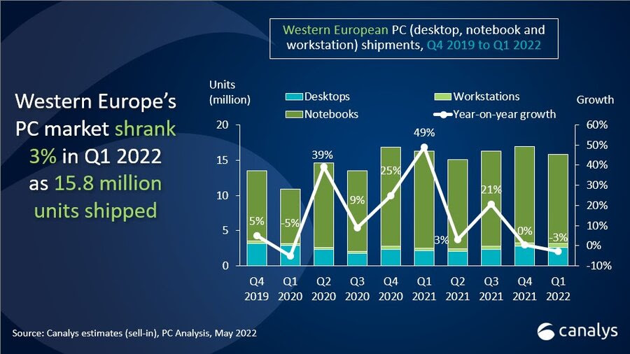 Besonders hart getroffen hat es den Tablet-Markt in Westeuropa. Im ersten Quartal 2022 fielen die Lieferzahlen für Tablets das dritte Quartal in Folge. Canalys verzeichnet für Q1/2022 einen Rückgang der Tablet-Absatzzahlen um 22 Prozent auf 6,5 Millionen Tablets-PCs. Die Marktdurchdringung für Tablets im Consumersegment sei während der Corona-Pandemie in die Höhe geschnellt und nähere sich der Sättigung, resümiert Canalys. Der prognostizierte Nachfragerückgang führt bei fast allen Anbietern zu einem starken Rückgang der Auslieferungen.