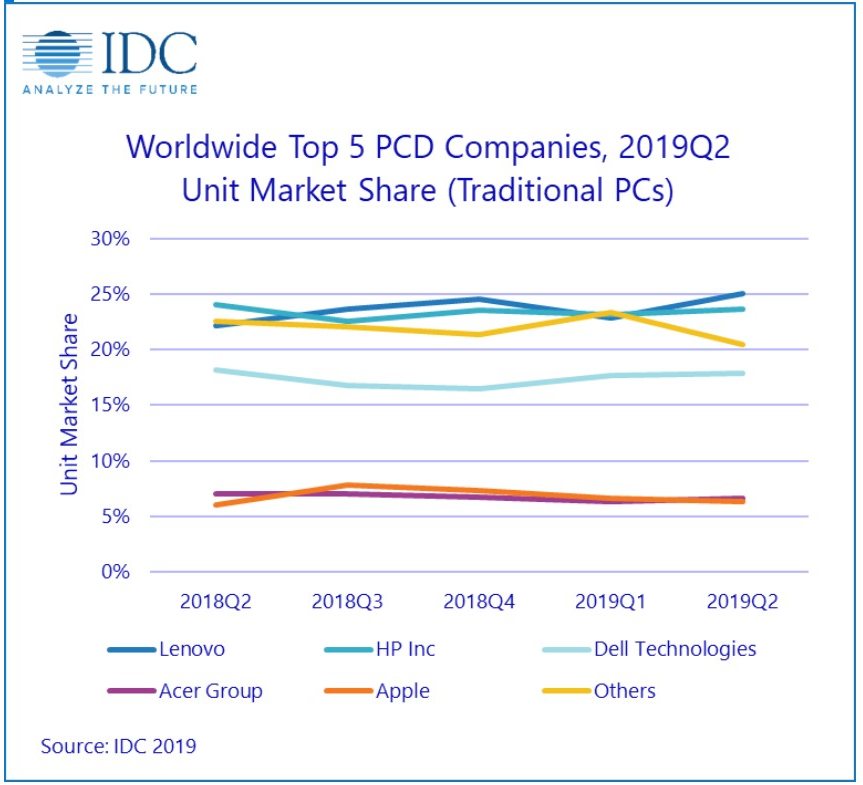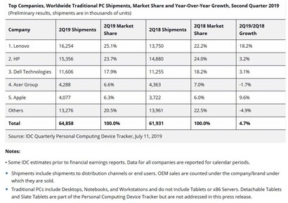 Lenovo überholte HP und erreichte die Spitzenposition im Ranking der größten PC-Hersteller in Q2/2019. Die Chinesen eroberten 25,1 % des Marktes mit mehr als 16,2 Millionen ausgelieferten Personal Computern. HP belegte mit einem Wachstum von 3,2 % gegenüber dem Vorjahr den zweiten Platz. Dell Technologies behauptete die dritte Position mit einem soliden Wachstum von 3,1 %. Acer musste in diesem Quartal einen Rückgang verzeichnen. Apple belegte Rang fünf in der Top 5 und lieferte fast 4,1 Millionen Macs aus.