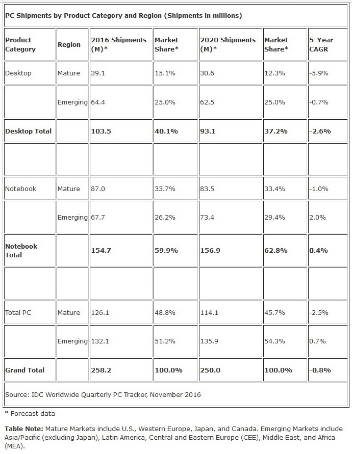 Gartner schätzt den PC-Markt in Deutschland für das 3. Quartal 2016 als recht stabil ein. Die Marktforscher von IDC gehen für den weltweiten PC-Markt ebenfalls davon aus, dass sich die Absatzzahlen in den kommenden Jahren konsolidieren werden. Aber auch schon für 2016 sieht IDC die Absatzsituation für PCs etwas freundlicher. IDC rechnet damit, dass das globale Absatzvolumen für Personal Computer 258,2 Millionen Geräte betragen wird. Das sind 6,4 Prozent weniger als 2015 (YoY). Zuvor war IDC von minus 7,2 Prozent ausgegangen.