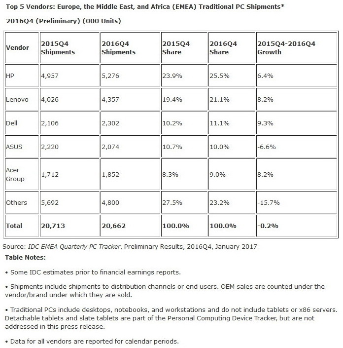 Wie IDC in den vorläufigen Ergebnissen der Analyse des PC-Markts in EMEA feststellt, hat sich das Absatzvolumen für Personal Computer im 4. Quartal 2016, im Vergleich zum Vorjahr (Q4/2015), bei 20,713 Millionen Einheiten stabilisiert (-0,2 Prozent). Einen großen Anteil daran hatte der Bereich Notebooks. Laut IDC konnten Laptops in allen EMEA-Regionen bei den Lieferzahlen im Durchschnitt um 2,9 Prozent (YoY ) zulegen, in Westeuropa um 2,7 %.